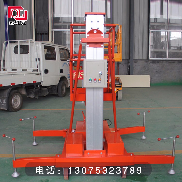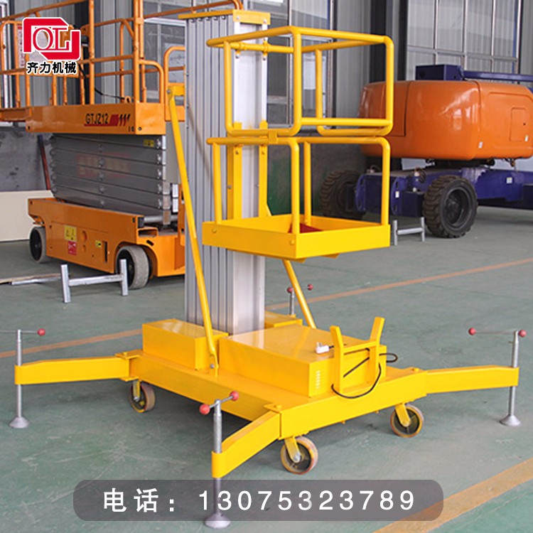 機身底座設有活動(dòng)輔助輪,提供良好的拐彎性能,以及輕易跨越一般的地面障礙,單桅桿機種設有貨車(chē)裝卸輔助裝置,可雙人進(jìn)行裝卸。鏈條負荷**系統10倍,并設有鋼絲**保護裝置,確保升降順暢。